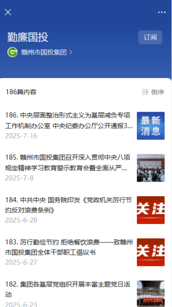强化“阵地宣廉”,持续推进阵地迭代升级。完成赣州国资国企党建馆设施设备智慧化改造,提升廉洁教化功能,充实中央八项规定精神学习内容,打造集展示、教育、互动于一体的沉浸式廉洁文化宣传平台。用好线上宣传阵地,充分利用集团官网、微信公众号等线上平台,定期发布廉洁文化资讯、展示廉洁建设成果,营造浓厚的廉洁文化氛围。构建全域廉洁矩阵,鼓励各党支部紧密结合工作实际,精心打造廉洁阵地,形成多点开花、亮点纷呈的廉洁文化格局。