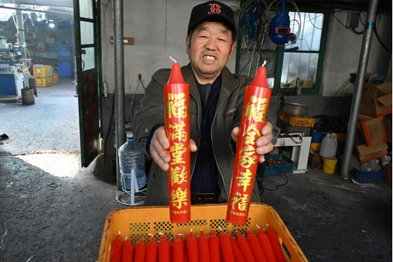 本网青岛讯 (通讯员 张涛)“快来看看我制作的大红蜡烛。这一支蜡烛就有1斤重。”1月13日,冬日和煦的阳光照在山东省青岛市即墨区段泊岚镇西大于庄村农民王际昌的农家小院。王际昌手里的大红蜡烛引起了记者的注意,“新人结婚、过年时家里摆上这样一对大红蜡烛,喜庆又热闹,而且蜡烛还可以根据客户要求单独定制,十分受市场欢迎。”王际昌笑呵呵地说道。山东省青岛市即墨区段泊岚镇西大于庄村灯笼制作工坊的农民在包装刚
